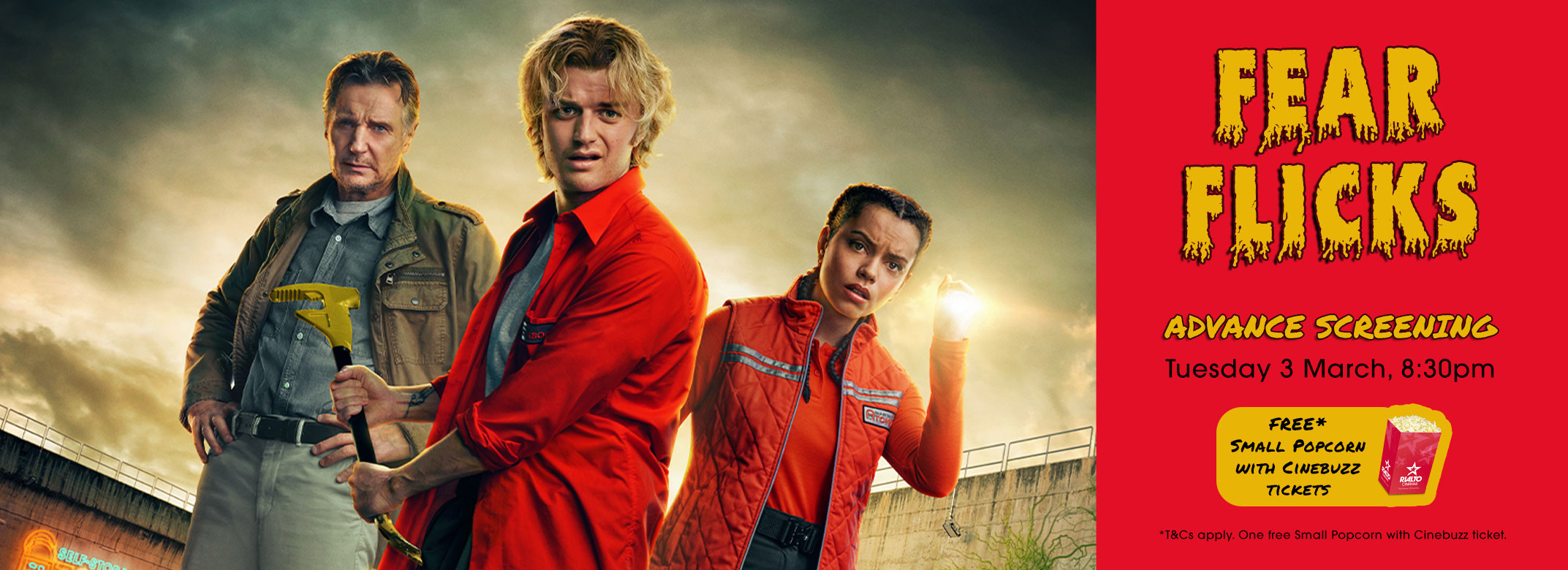 *$1.75 online booking fees apply. One Small Popcorn per Cinebuzz ticket. To receive the free Small Popcorn you must be a member of Cinebuzz Rewards, logged into your account at time of ticket purchase and select the 'Cinebuzz Fear Flicks Package'. For in-cinema purchase you must swipe your Cinebuzz card. Popcorn available for collection at the time of screening. ^Based on the reward benefit for a standard admission. Rewards points cannot be redeemed for Special Screenings, Film Festivals & Events.