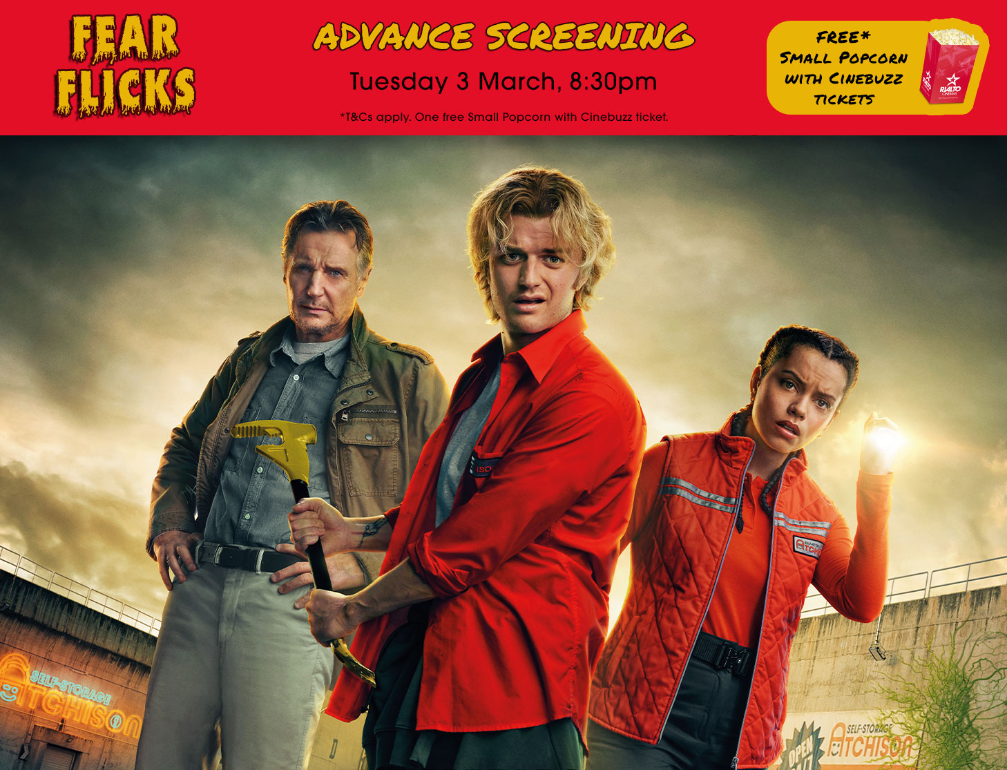 Joe Keery, Georgina Campbell, and Liam Neeson star in the explosive sci-fi thrill ride COLD STORAGE. See it first at our Fear Flicks screening, where Cinebuzz tickets get a FREE* Small Popcorn! Log in to your Cinebuzz account now to unlock this special offer.