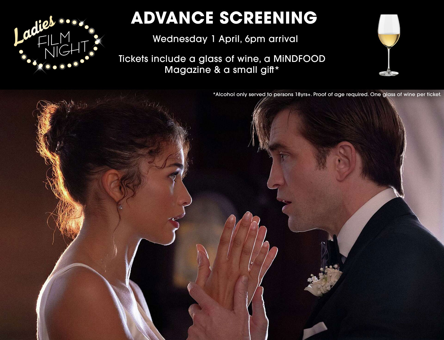 Terms & Conditions: *$1.75 booking fee applies. Alcohol will only be served to persons 18yrs+ proof of age required. Package includes: movie ticket, a glass of wine, a MiNDFOOD magazine and a small gift (product may vary). Seats strictly limited. ^One winner selected at random on the night.
